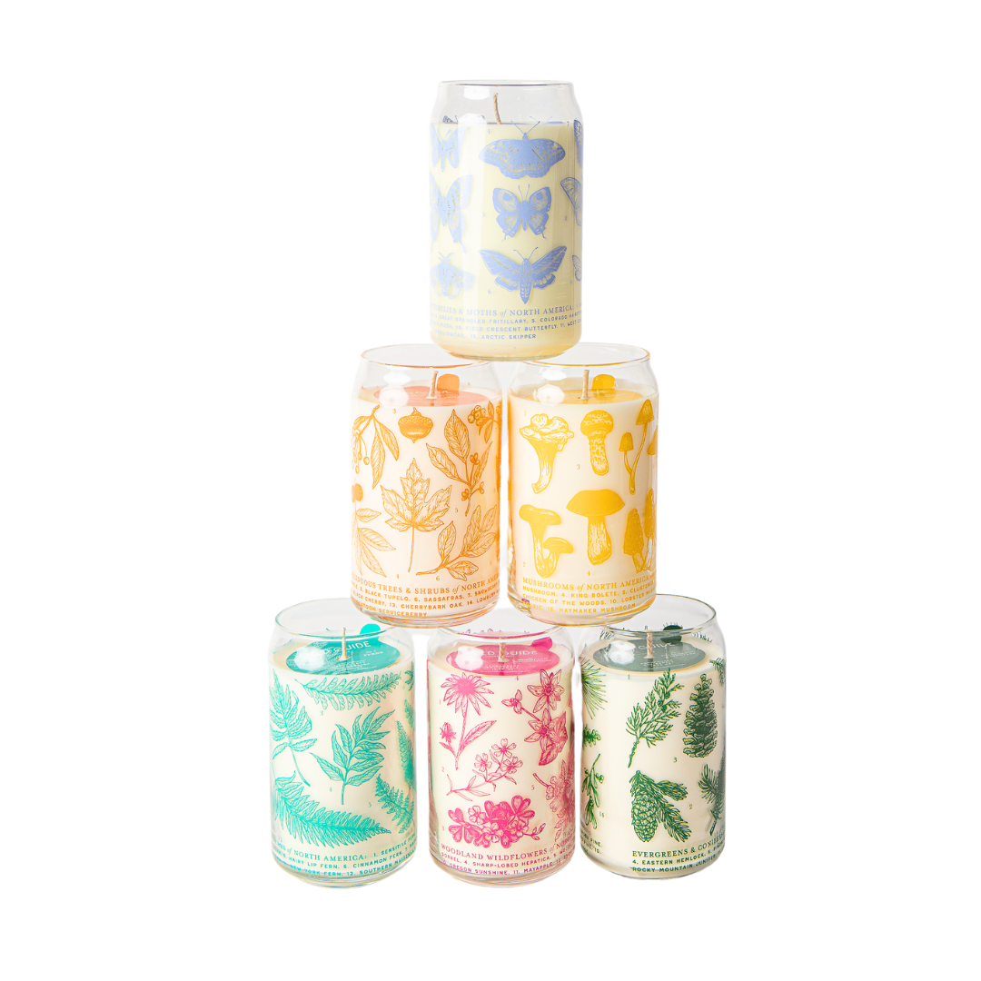 The Forest Floor collection celebrates all the beautiful things that inhabit the understory of the forest canopy. Inspired by richly colored and intricately illustrated field guides, our Forest Floor candles are hand-poured into 16oz glass containers screen printed with brightly colored mini field guides, meant to be repurposed as drinking glasses once the candle is done.