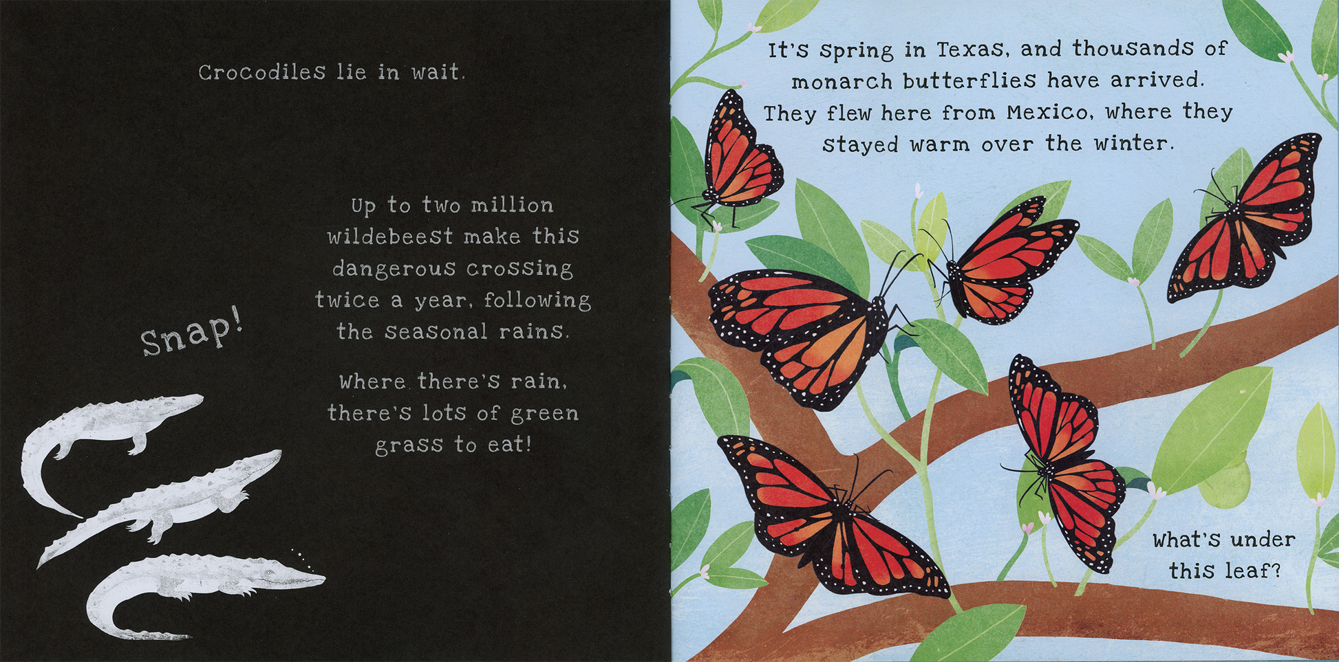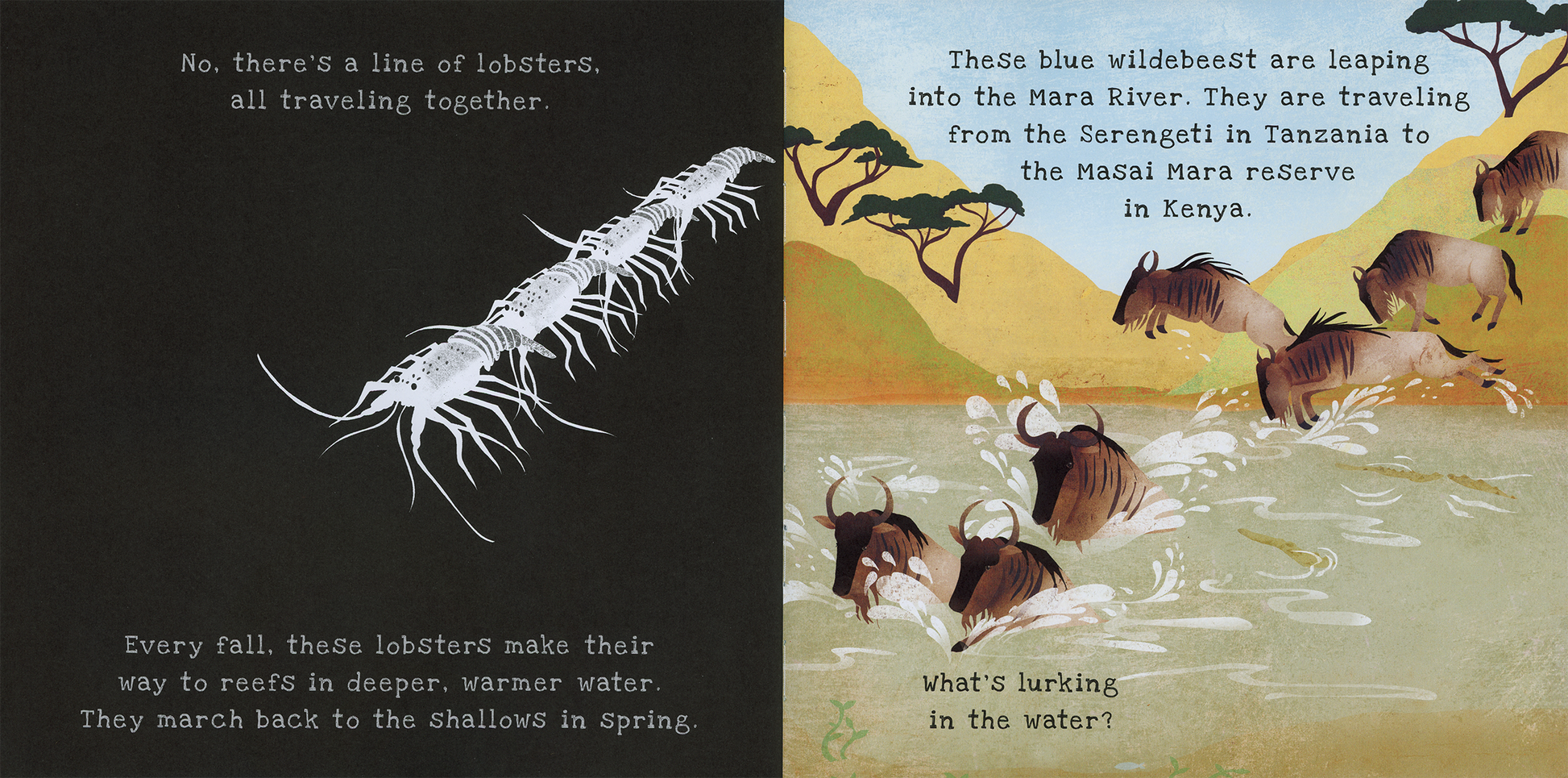Many animals migrate to find food, water, warmer weather, or a safe place to have their young. Follow along on 15 amazing animal journeys by shining a light through this book's special pages.