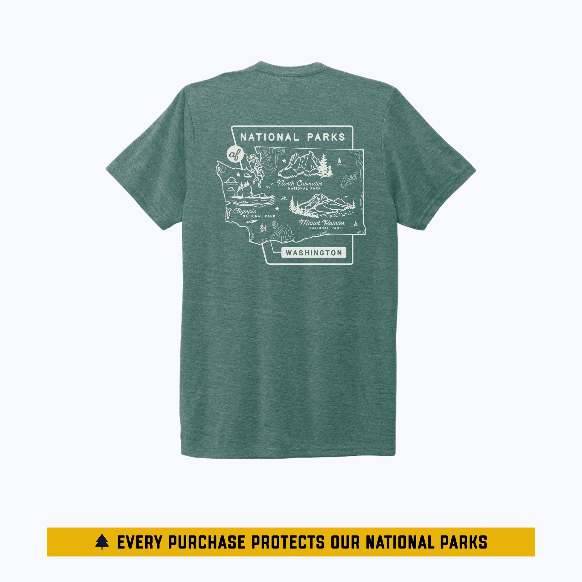 Explore Washington's national parks in style with our Sea Green Eco Tee! This midweight t-shirt, made from 6 recycled water bottles and organic cotton, features original designs and is super butter soft. Plus, it's part of our EcoTee collection, so you can feel good about protecting the environment and giving back to our parks. Make a statement with this eco-friendly and comfy tee! * Fabrics: organic cotton, recycled polyester and modal * Reduces 4 kb of carbon emissions * Reuses an average of 6 recycled water bottles per shirt * Saves 145 gallons of water per shirt * Carbon neutral * Incredibly soft * Ethically made * Printed in the PNW * Designed in the PNW * Part of your purchase is donated to organizations like Washington's National Park Fund that help protect our National Parks * Mid-weight shirt: 4.2oz * Custom inside shirt label