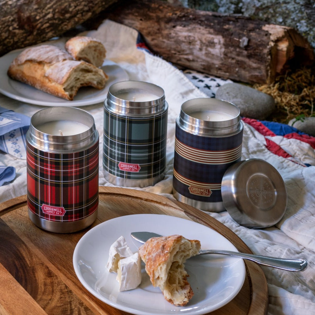 Calling all camp enthusiasts and vintage plaid lovers! Meet your new favorite candle - inspired by vintage thermoses and housed in an actual (and reusable!) 12oz stainless steel vacuum insulated flask, our new Vintage Canteen Candles are ready to enjoy cozied up at home or out on your next adventure!