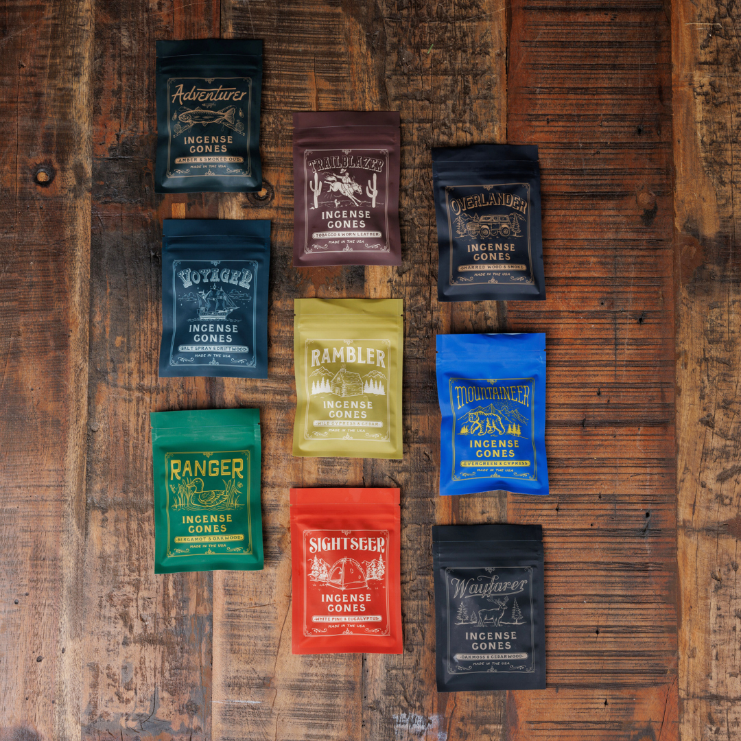 The Wanderer incense collection is an ode to those who roam. To the rolling hills and grassy knolls they traverse in search of peace, solitude and oneness with the natural world. From the Rambler to the Ranger, the Wayfarer to the Trailblazer, these hand-dipped incense cones were created as a reminder that we humans have an innate need to explore, and that not all who wander are lost.